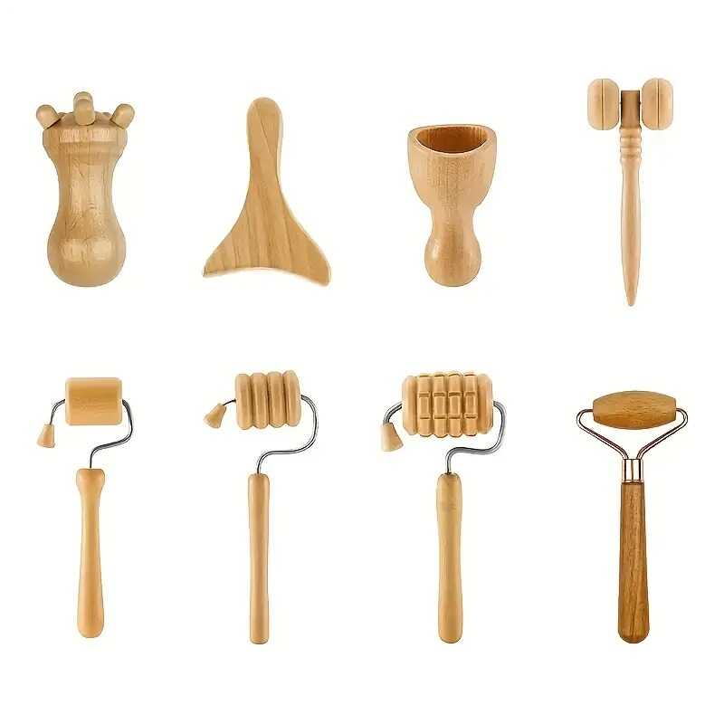 Ce set de 8 outils de massage en bois est conçu pour stimuler la circulation sanguine et soulager les tensions musculaires de manière naturelle. Idéal pour les techniques de massage par percussion, chaque outil peut être utilisé pour un massage en roulement sur la surface du corps ou pour une pression ciblée sur des points spécifiques. Parfait pour une utilisation quotidienne sur le cou, les épaules, le dos, la taille, les bras et les mains. Grâce à leur design ergonomique, ces outils en bois offrent une prise en main confortable et un massage efficace sans agresser la peau. Utilisés manuellement, ils favorisent la détente, le drainage lymphatique et le bien-être général. Adaptés à un usage domestique ou professionnel en spa.