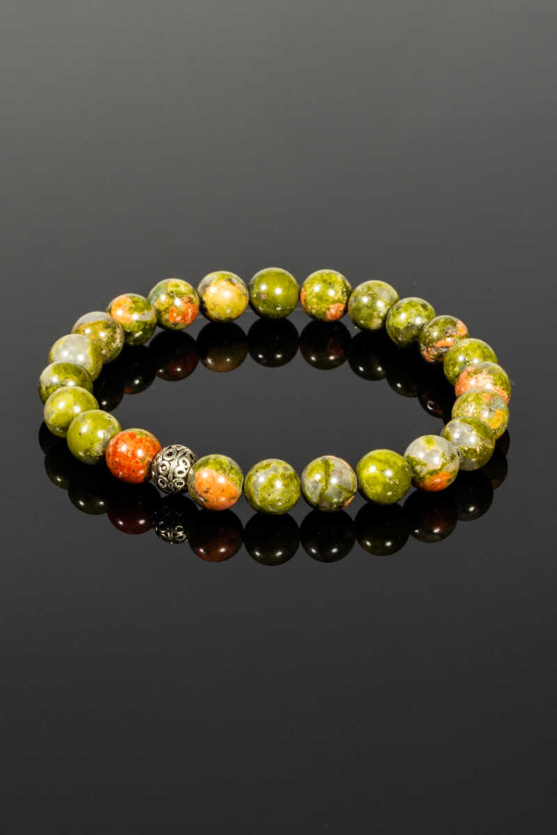Bracelet en pierre naturelle Unakite : Le bracelet en pierre naturelle Unakite est un accessoire unique qui reflète les couleurs harmonieuses de la nature. Grâce à la combinaison de tons verts et roses, l’unakite est réputée pour favoriser l’équilibre et l’harmonie. Élégant pour un usage quotidien et raffiné pour les occasions spéciales, ce bracelet se distingue par sa qualité et sa durabilité. Un cadeau plein de sens à offrir à vous-même ou à vos proches.