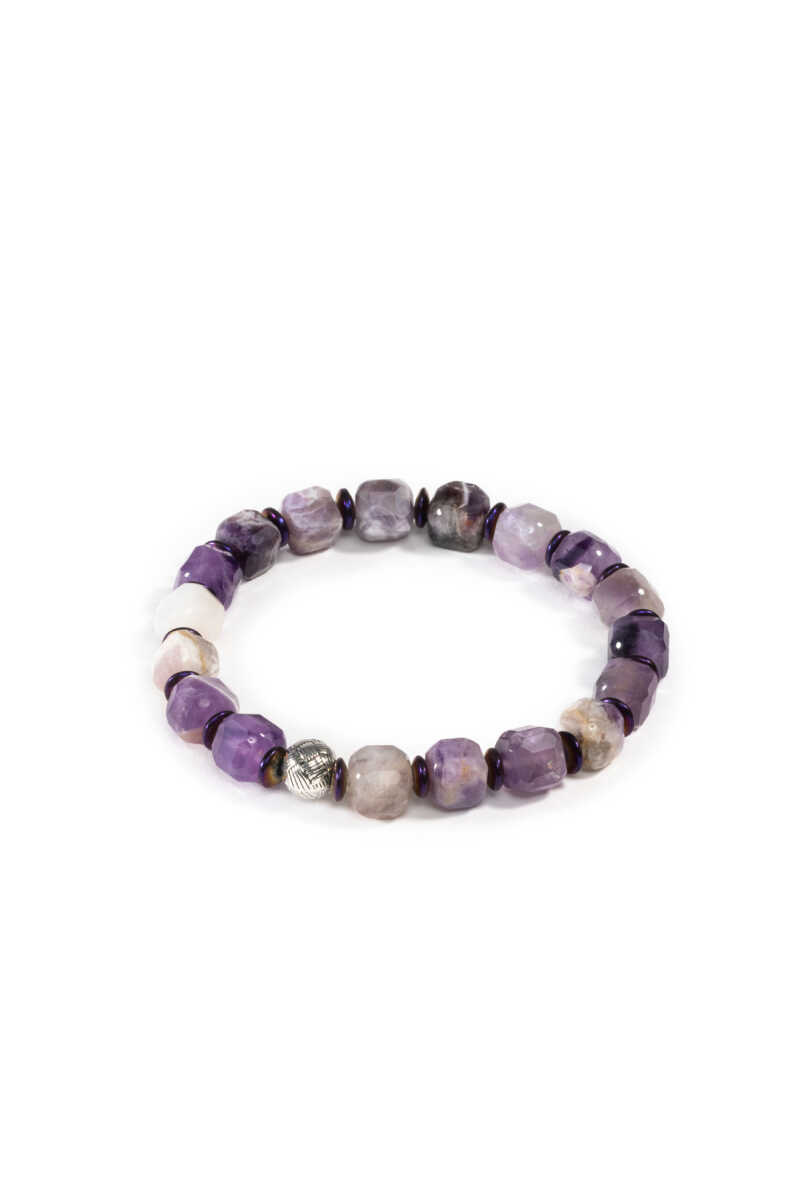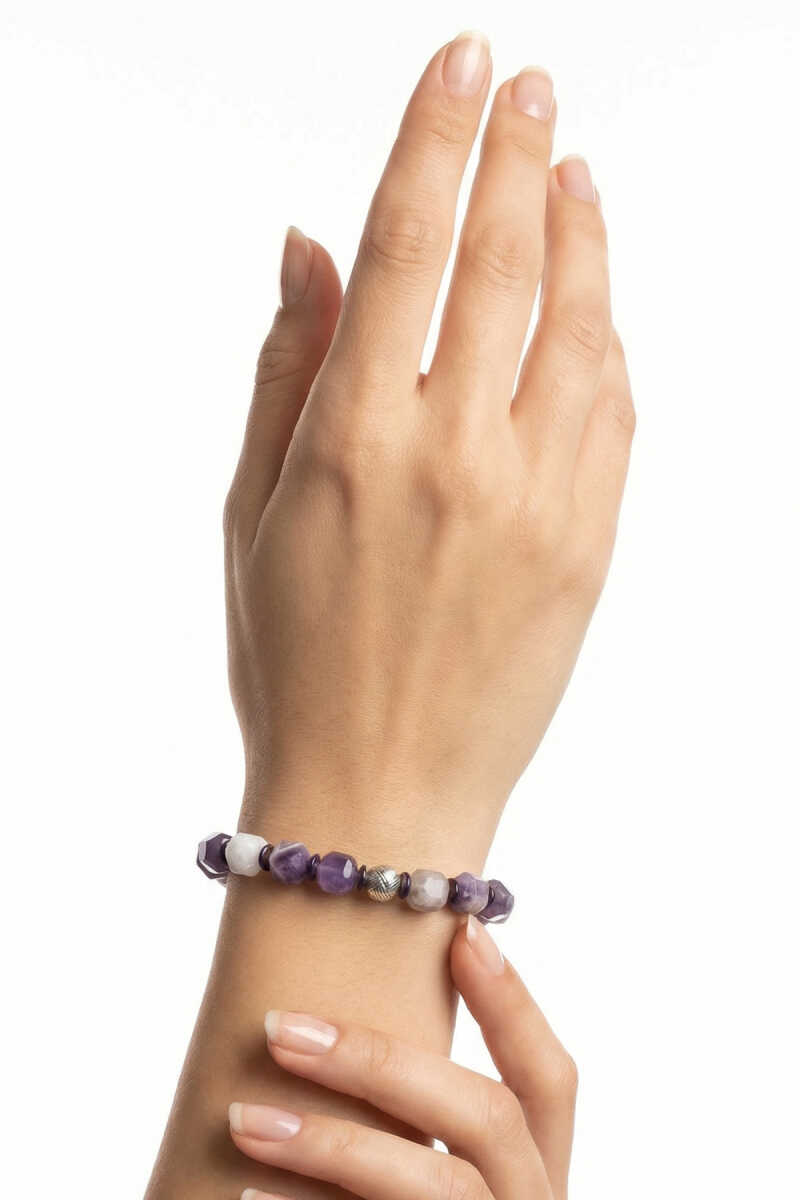 Küp formdaki taşlar bilekliğe çağdaş ve karakterli bir görünüm kazandırırken, ametistin mor tonları zarif bir şıklık sunar. Günlük kullanıma uygun olduğu gibi meditasyon, yoga ve enerji çalışmaları sırasında da tercih edilir.