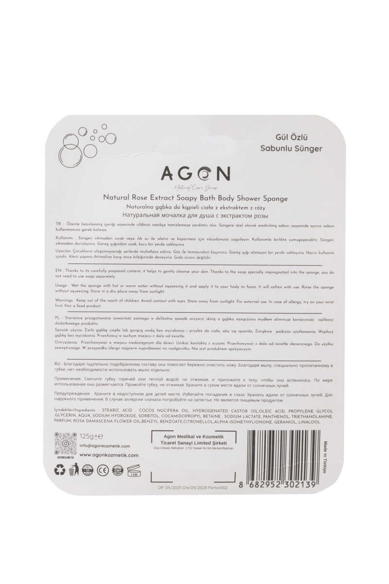Kullanım: Duş süngerini ıslatarak vücudunuza nazikçe masaj yapın, köpürdükten sonra bol su ile durulayın. Günlük kullanım için uygundur.