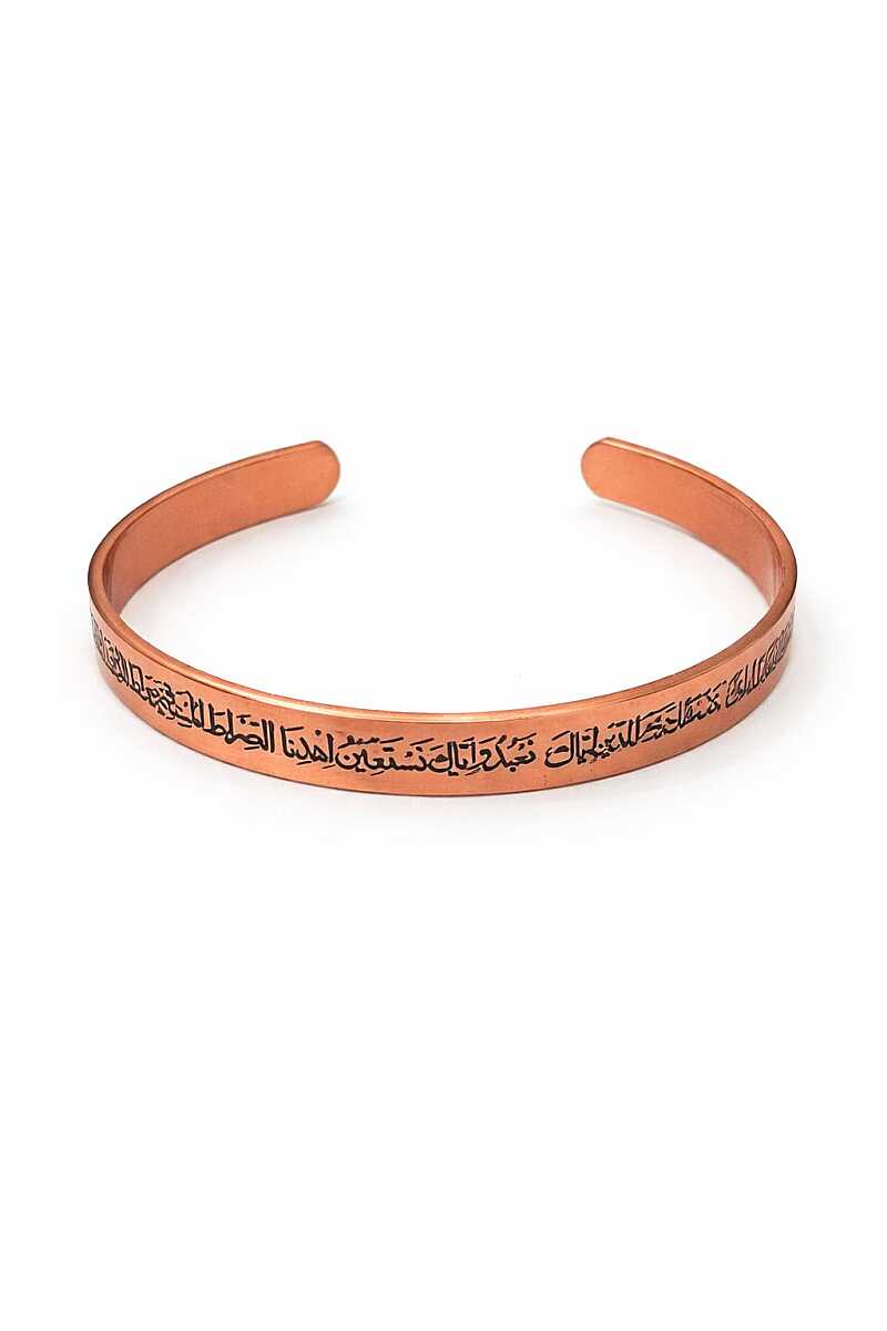 Özenle tasarlanmış saf bakır bileklik, üzerinde yer alan Fatiha Suresi işlemesi ile hem şık bir aksesuar hem de manevi değeri yüksek özel bir üründür. Günlük kullanımda tarzınızı tamamlayan bu bileklik, aynı zamanda anlamlı bir sembol taşır.