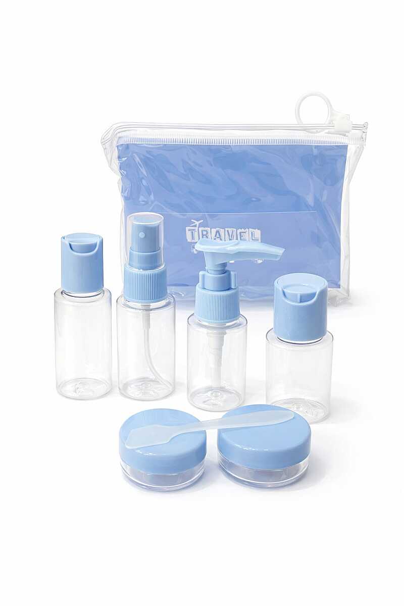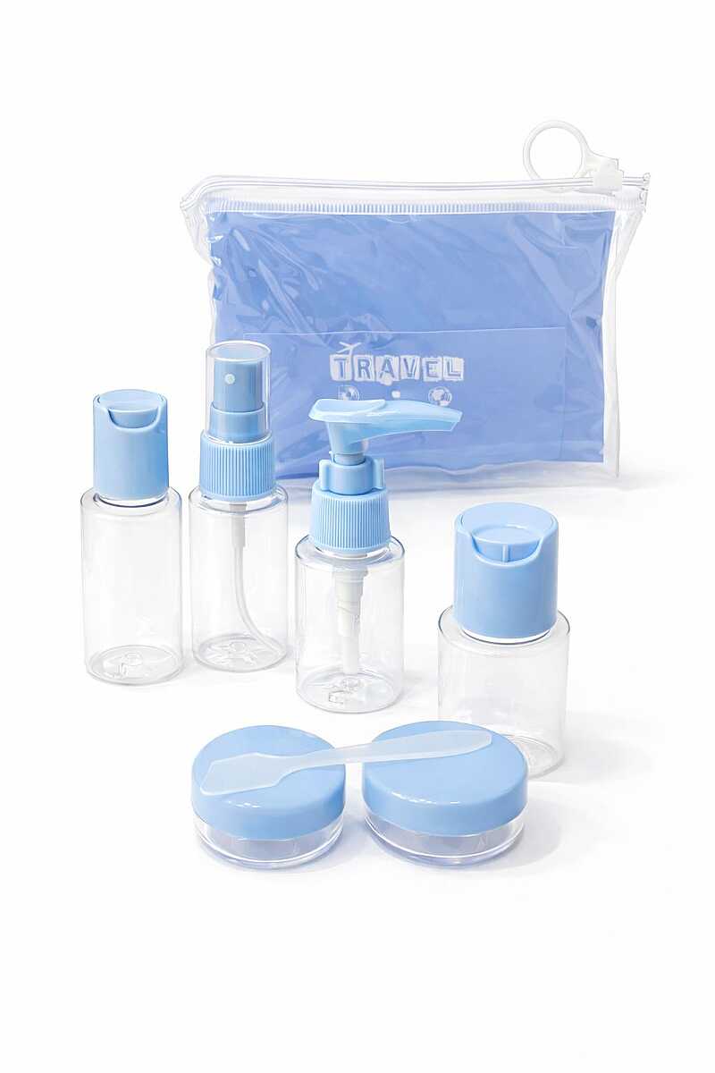 Set içerisinde; sprey şişeler, pompalı şişe, kapaklı şişe ve krem kutuları yer alır. Ayrıca yanında gelen şeffaf taşıma çantası ile tüm ürünlerinizi düzenli bir şekilde yanınızda taşıyabilirsiniz.